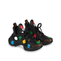 The LV x YK LV Archlight sneaker comes in calf leather printed with multicolored Painted Dots, a key theme of the Louis Vuitton x Yayoi Kusama collection, which marks the second major collaboration between the House and the renowned Japanese artist. This cult sneaker, designed by Nicolas Ghesquière, is notable for its oversized, wave-shaped outsole. Detailed Features - Black - Calf leather - Oversized rubber outsole (5 cm / 2 inches) - LV Circle on the tongue and outsole - Patent Monogram-canvas back loop - Made in Italy