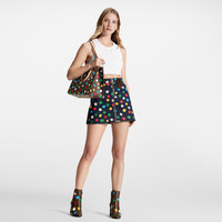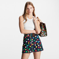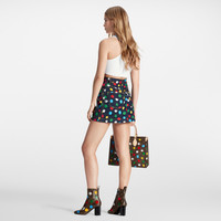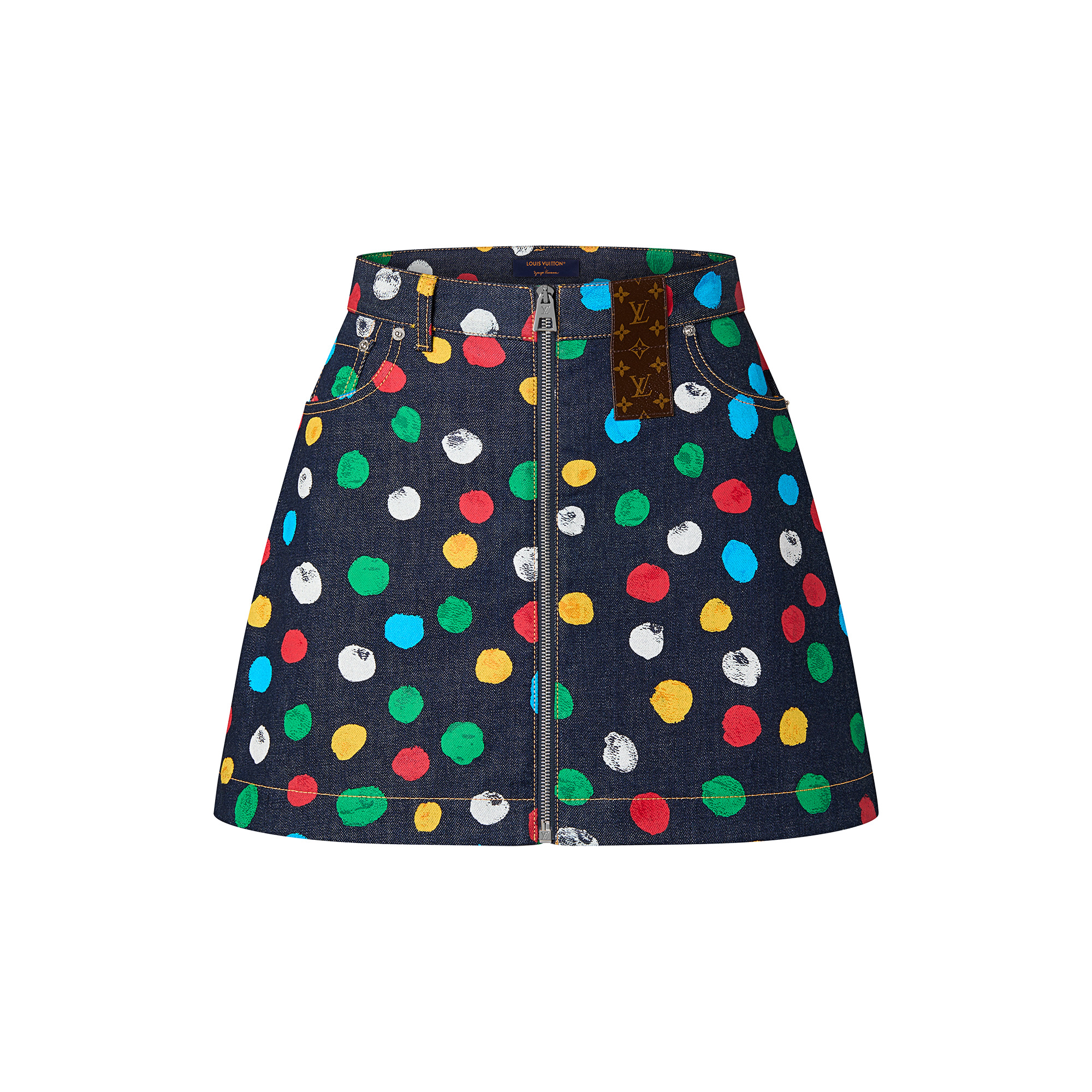 A joyful everyday statement: This mini skirt is crafted from classic deep blue denim detailed with contrast yellow stitching for a structured feel. The playful allover Louis Vuitton x Yayoi Kusama print features the artist’s signature Painted Dots in an upbeat array of colors, each detailed with unique brushstrokes for a hand-finished look. Complete with an exposed front zipper and an oversized Monogram canvas belt loop. Detailed Features - Length : 42 cm / 16,5 inches - Main Material : 100% Cotton - Indigo, Blue - Regular fit - Made in Italy