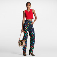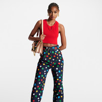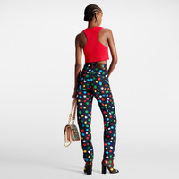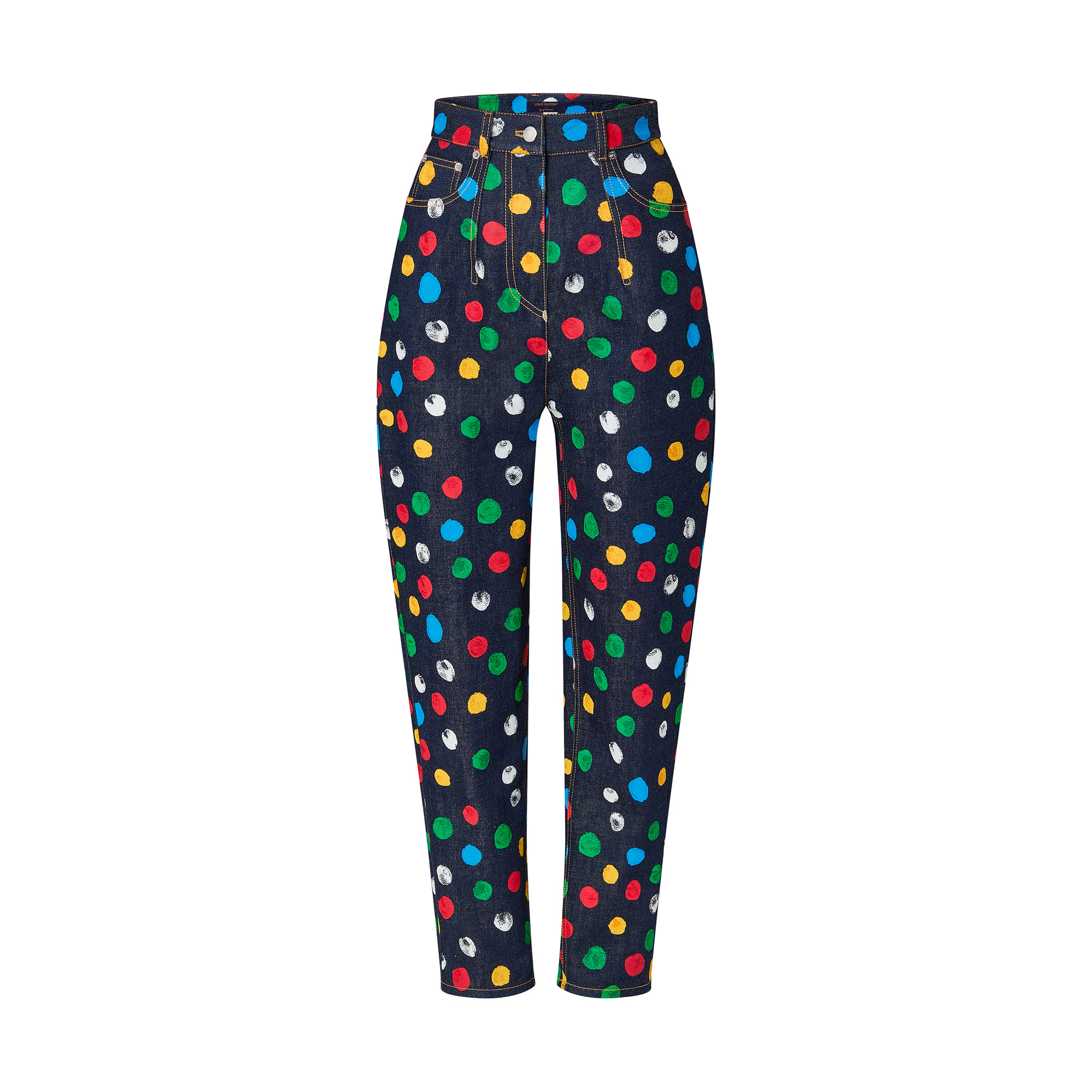 A comfortable casual cut meets a playful, colorful signature from the exclusive Louis Vuitton x Yayoi Kusama capsule: These jeans are crafted in a flattering high-waisted carrot shape from classic blue denim finished with contrasting yellow stitching for a structured feel. The artist’s exuberant Painted Dots feature as an allover print in an upbeat array of colors, each bearing unique brushstrokes for a hand-finished look. Complete with a Monogram canvas signature patch. Detailed Features - Main Material : 100% Cotton - Indigo, Blue - Regular fit - Made in Italy