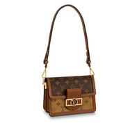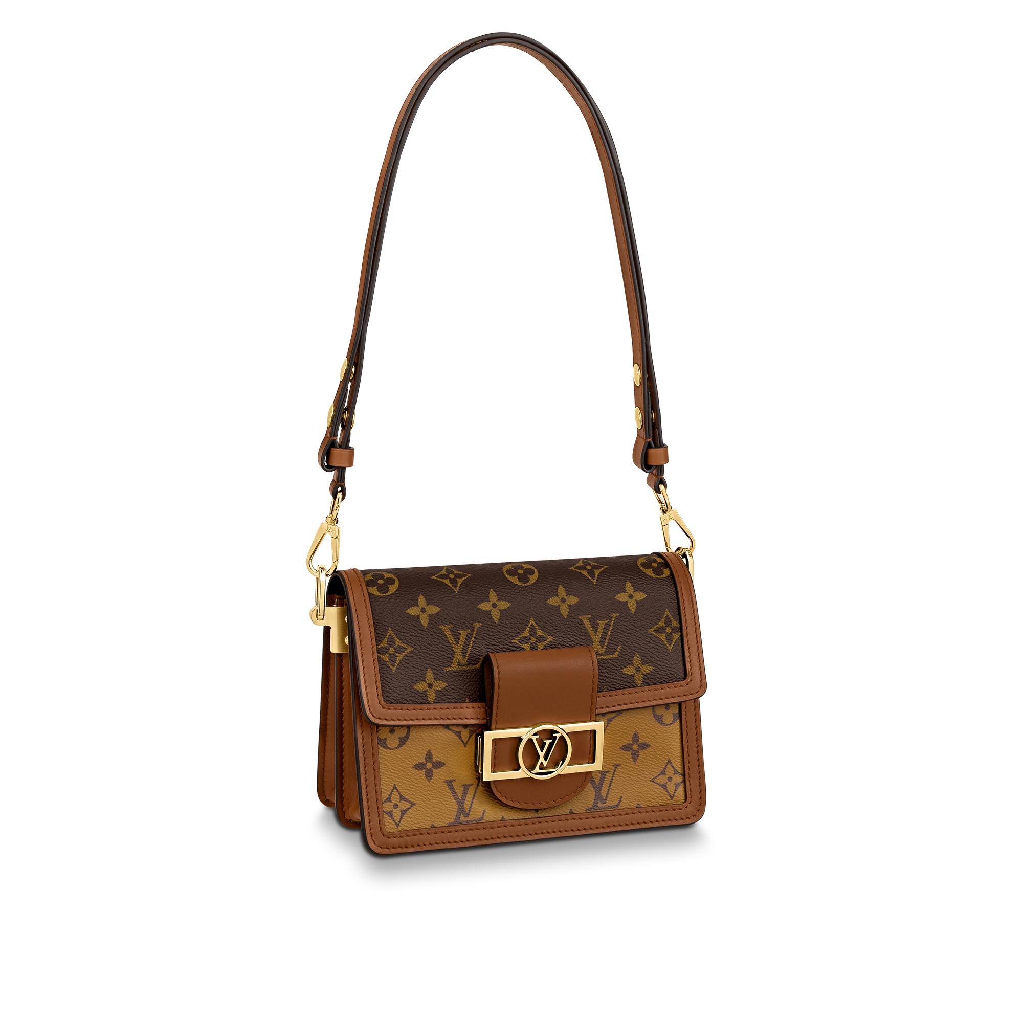 For Spring-Summer 2019 Nicolas Ghesquière unveils a new must-have: the Dauphine Mini handbag. This adorably compact model is crafted from Monogram and Monogram Reverse canvas, trimmed with smooth tan calfskin. The high-shine LV lock and leather smart strap add a modern twist to this signature piece, which is perfectly sized for day-to-evening wear. Detailed Features - Monogram and Monogram Reverse canvas - Smooth calfskin trim - Black microfiber lining - Gold-color hardware - Magnetized front lock - 2 inside compartments - Inside back flat pocket - Strap:Removable, adjustable - Strap drop: 10.2 inches - Strap drop max: 19.3 inches - The reference is either made in France, Spain, Italy or in the US. Length: 7.9 inches Height: 5.9 inches Width: 3.5 inches