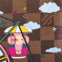 Louis Vuitton's mascot Vivienne is pictured having fun at a fair on this Christmas 2020 edition of the Mini Pochette Accessoires in Damier Ebene canvas. The joyful illustrations featuring House symbols capture the spirit of the season. This pouch can be attached to a belt or bag thanks to its gold-tone chain. Detailed Features - Rose Ballerine Pink - Damier Ebene coated canvas - Textile lining - Gold-color hardware - Chain with hook - Zip closure - Chain:Not removable - Chain drop: 5.9 inches - This reference is either Made in France, Spain, Italy or in the US. Length: 6.1 inches Height: 4.1 inches Width: 1.6 inches