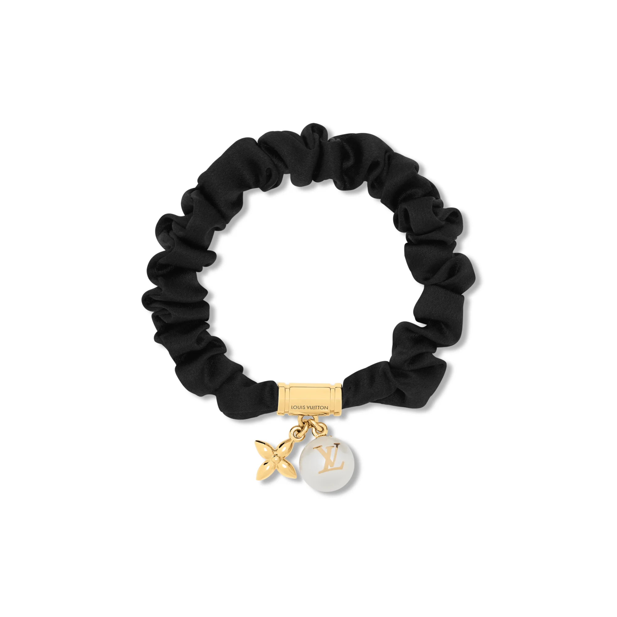 The stylish and functional Mix Pearls elastic combines the evocative beauty of the pearl with two emblematic House icons. Attached to a plush satin cord, a lustrous white resin pearl accented with the LV Initials is paired with a Monogram Flower charm in gold-colored metal. Perfect for adding a glint of signature elegance to any hairstyle. - Black - Satin - Gold-toned metal - White resin pearl - Signature charms