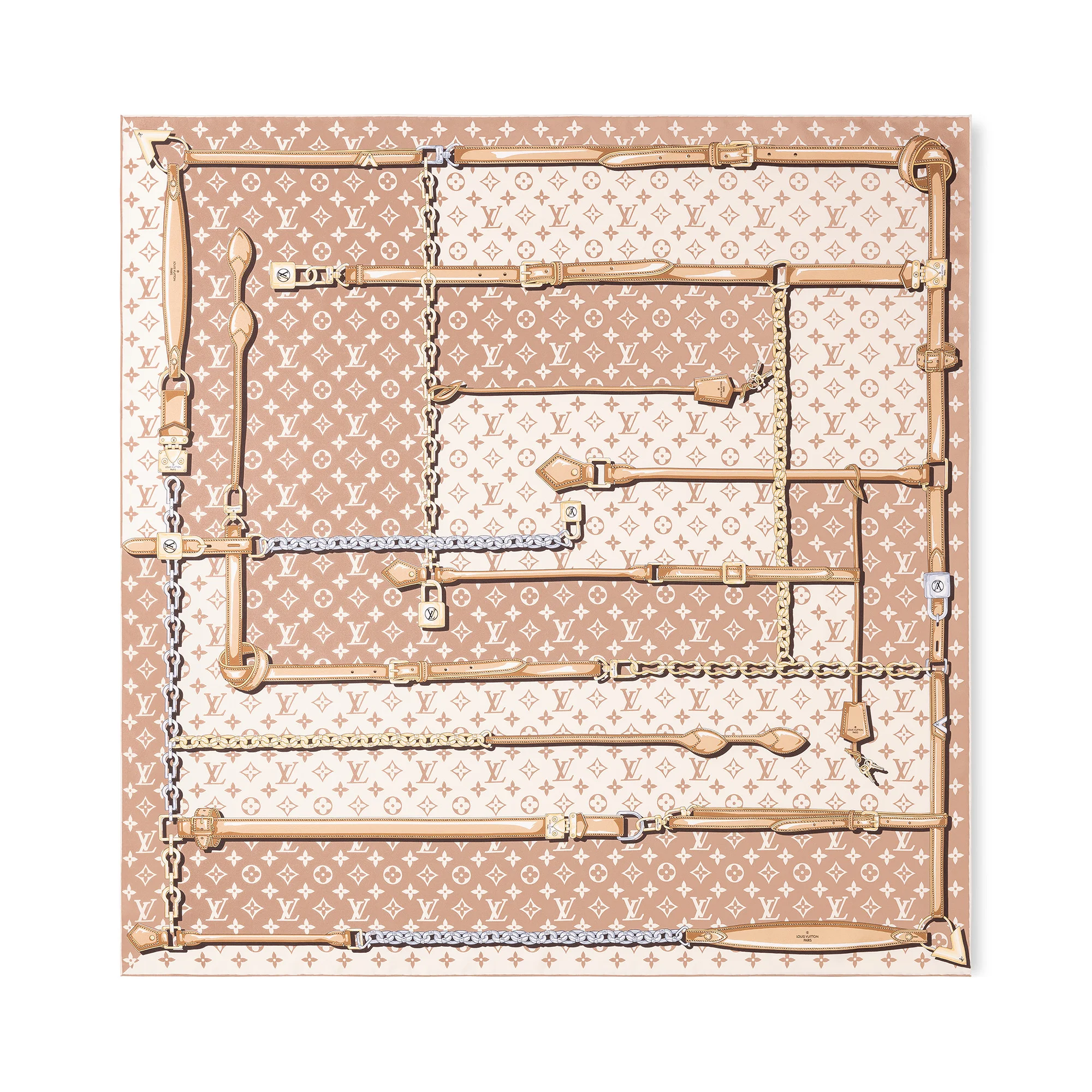 A perfect gift, this stylish silk twill square is printed with emblematic Louis Vuitton details - leather straps, metal chains and padlocks - on a background of the iconic Monogram pattern. Detailed Features - Dune - 100% Silk - Inkjet print - Hand-rolled edges Length: 35.4 inches Height: 35.4 inches