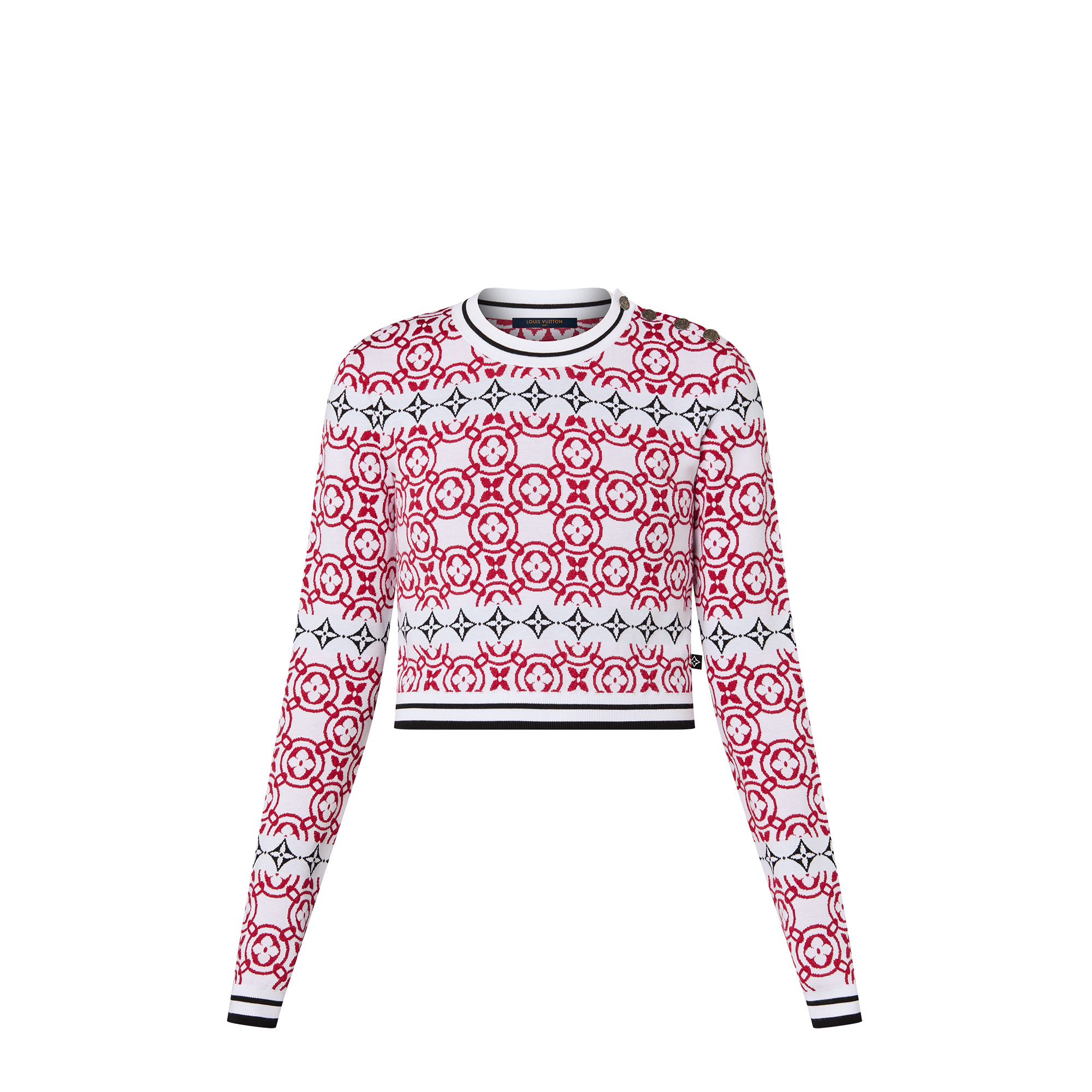 This season’s playfully graphic Monogram Flower tile motif features as a statement jacquard on this chic cropped pullover. Spun from a comfortable stretchy cotton-silk blend with contrasting striped hems for a sporty touch. The shoulder is dotted with elegant aged silver buttons for versatile styling options. Detailed Features - Main Material : 59% Cotton, 33% Silk, 5% Polyamide, 3% Elastane - Red and White - Regular fit - Made in Italy