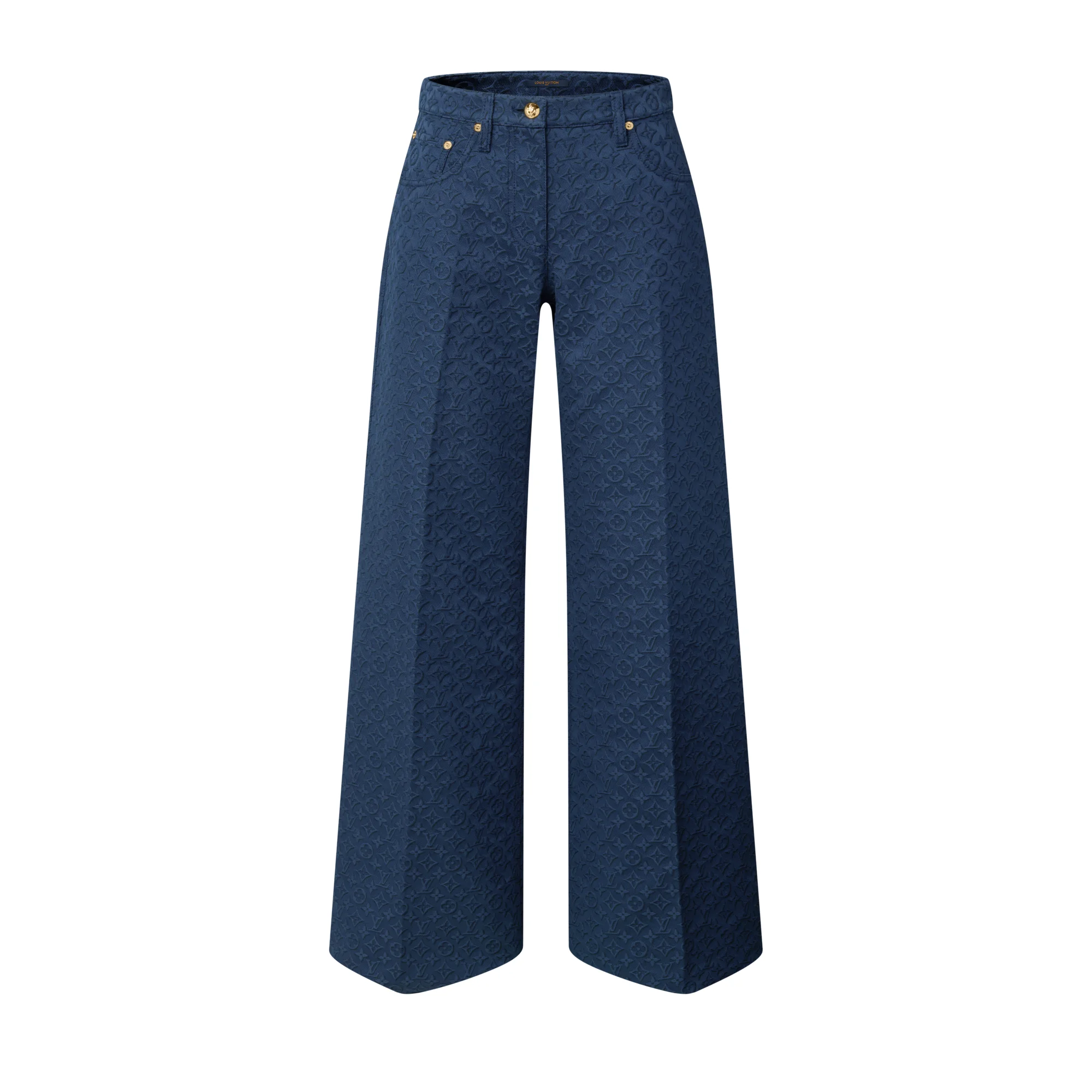 These dressy pants are made from cotton gabardine signed all over with a tone-on-tone Monogram jacquard. They are cut in a clean, flared shape with crisp creases on the front and back of the legs emphasizing the structure. Gold-toned hardware nods to nautical codes, including a domed anchor button on the fastening. - Indigo Blue - 100% cotton gabardine - Button and zipper fly - 5 pockets - Belt loops - Signature jacquard - Gold-toned hardware - Made in Italy