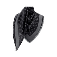 This sophisticated shawl, woven with a tone-on-tone Monogram pattern, is given a subtle shimmer by the use of a soft shine yarn. Detailed Features - 47% silk, 26% viscose, 17% wool, 10% polyester - Louis Vuitton Paris signature in lurex Height: 56.1 inches Width: 56.1 inches
