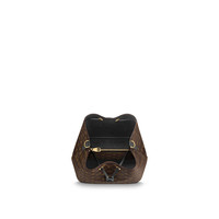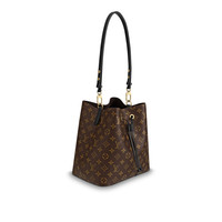 A true House icon, the NéoNoé bucket bag revisits a 1932 design by Gaston-Louis Vuitton. The original was created to transport bottles of Champagne in style; this modern version in Monogram canvas features a sleek shape, colorful leather trim and a matching bonded lining. The adjustable smart strap can be slung over the shoulder or lengthened for a trendy cross-body carry. Detailed Features - Black - Monogram coated canvas - Colored cowhide leather trim - Microfiber lining - Gold-color hardware - Drawstring - Metal eyelets - 2 compartments - Zipped central flat pocket - Strap:Removable, adjustable - Strap drop: 13.0 inches - Strap drop max: 22.0 inches - The reference is either made in France, Spain, Italy or in the US. Length: 10.2 inches Height: 10.2 inches Width: 6.9 inches