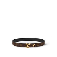 The Pretty LV reversible belt is a tribute to the House’s creative know-how. The design features an LV Initiales buckle and an end tip in the form of an elegantly cut Monogram Flower, both in gleaming gold-tone metal. With sumptuous leather on one side and classic Monogram canvas on the other, it’s as versatile as it is stylish. Detailed Features - Width: 1.1 inches/3 cm - Buckle height: 1.4 inches/3.5 cm - Buckle width: 1.4 inches/3.5 cm - Monogram canvas recto side - Black leather verso side - Gold-color hardware - Metal cut Monogram Flower end tip - LV Initiales buckle Length: 35.4 inches Width: 11.8 inches