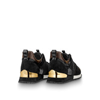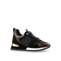An oversize LV Circle signature adorns the side of the Run Away sneaker in black or white suede calf leather with iconic Monogram-canvas trim. This advanced design features a technical outsole with a hidden fusbet for extra height and an eye-catching gold-tone metal stabilizer. Detailed Features - Suede calf leather and patent Monogram canvas - Technical rubber outsole - Made in Italy
