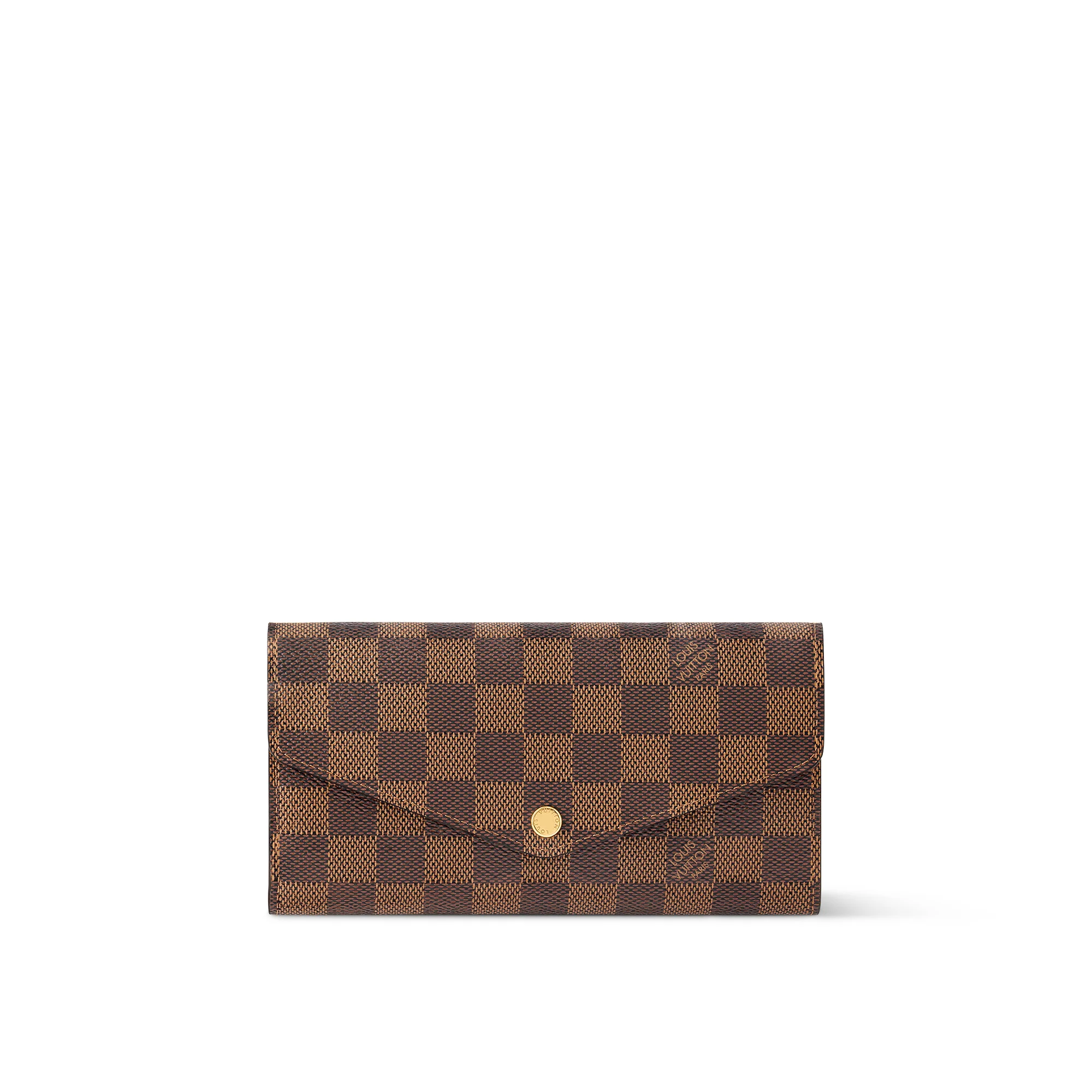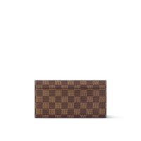The Sarah wallet comes in Louis Vuitton's historic Damier Ebene canvas, complemented by a grained-leather lining. This classic wallet combines a feminine look with a highly functional design, including two roomy compartments, a zipped coin pocket and numerous card slots. Its envelope-style flap is sealed with an engraved, gold-tone press-stud. Detailed Features - Damier Ebene coated canvas - Grained cowhide-leather lining - Gold-color hardware - Press-stud closure - 2 large gusseted compartments - Zipped coin pocket - Inside flat pocket - Outside flat pocket - 16 card slots - The reference is either made in France, Spain, Italy or in the US. Length: 7.5 inches Height: 3.9 inches