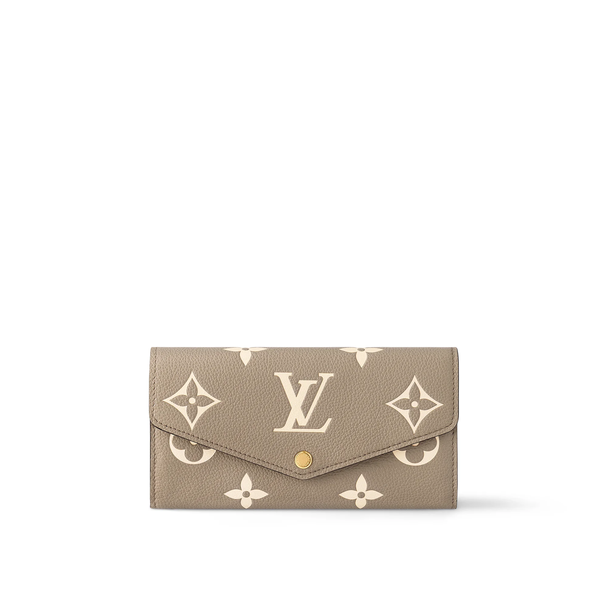 Louis Vuitton's classic Sarah wallet looks elegant in bicolor Monogram Empreinte leather, which is embossed with the signature Monogram pattern. The envelope-style flap, secured with a gold-tone press stud, opens to reveal a well-organized interior. In addition to two large compartments and several pockets, this wallet offers 16 card slots. Detailed Features - Tourterelle Gray / Cream - Monogram Empreinte embossed supple grained cowhide leather - Cowhide-leather lining - Gold-color hardware - Press-stud closure - 2 large gusseted compartments - Zipped coin pocket - Inside flat pocket - 16 card slots - This reference is either Made in France, Spain, Italy or in the US. Length: 7.5 inches Height: 4.1 inches Width: 0.8 inches