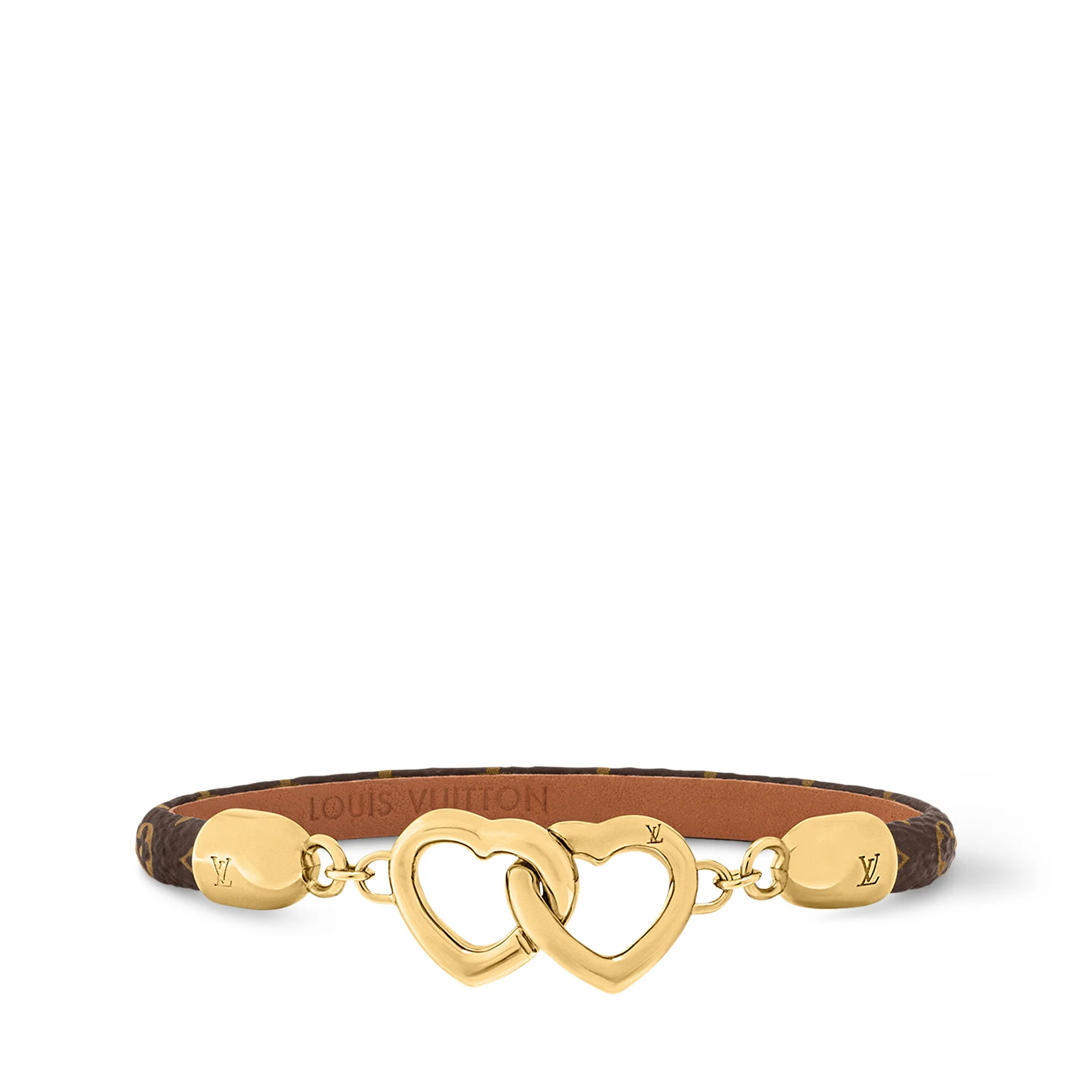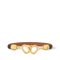 Chic and feminine, the Say Yes bracelet makes an ideal gift for loved ones. The focal point of the design is two interlocked hearts at the front with a discreet hook closure system. The slender Monogram calf strap is finished with a leather lining that demonstrates the House's impeccable attention to detail. Detailed Features - Sizes: 6.7 inches / 7.5 inches - Monogram canvas - Calf leather - Gold-color hardware - Two heart charms - Hook closure system Length: 7.5 inches