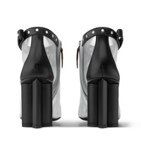 Seen at the Fall-Winter 2025 women's show, the Silhouette ankle boot is made of shimmering nylon mesh, offering a bold new take on transparency. The leather strap around the ankle is embellished with eyelets and LV Initials studs, while the zip has a pull in Monogram canvas. This model comes on a high heel shaped like a Monogram Flower. - Silver - Mesh/Monogram canvas - Signature hardware - Side zip - Leather outsole - Monogram Flower heel, 8cm/3.1 inch - Made in Italy