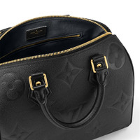 The Maison’s iconic Speedy 25 handbag is offered in this versatile edition, crafted from supple, embossed Monogram Empreinte leather. Elegant and compact, it is ideally sized for city life. Fitted with twin Toron handles and a detachable, adjustable leather strap, this timeless model can be carried by hand, worn on the shoulder or cross-body. Detailed Features - Black - Embossed supple grained cowhide leather - Supple grained cowhide-leather trim - Microfiber lining - Gold-color hardware - Double zip closure - Inside zipped pocket - Inside flat pocket - Padlock - Strap:Removable, adjustable - Strap drop: 16.9 inches - Strap drop max: 18.9 inches - Handle:Double - This reference is either Made in France, Spain, Italy or in the US. Length: 9.8 inches Height: 7.5 inches Width: 5.9 inches