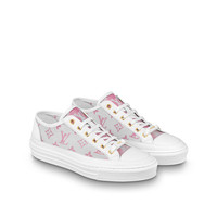 A colorful Monogram pattern on lightweight, technical fabric brings a fresh, summery feel to this seasonal version of Louis Vuitton's emblematic Stellar sneaker. Refined details, such as white calf-leather trim and gold-tone eyelets, elevate this classic design, which is finished with a toe cap in leather and outsole. Detailed Features - Pink - Technical fabric and calf leather - Rubber outsole - Louis Vuitton signature on the outsole - Made in Italy