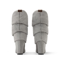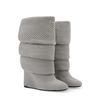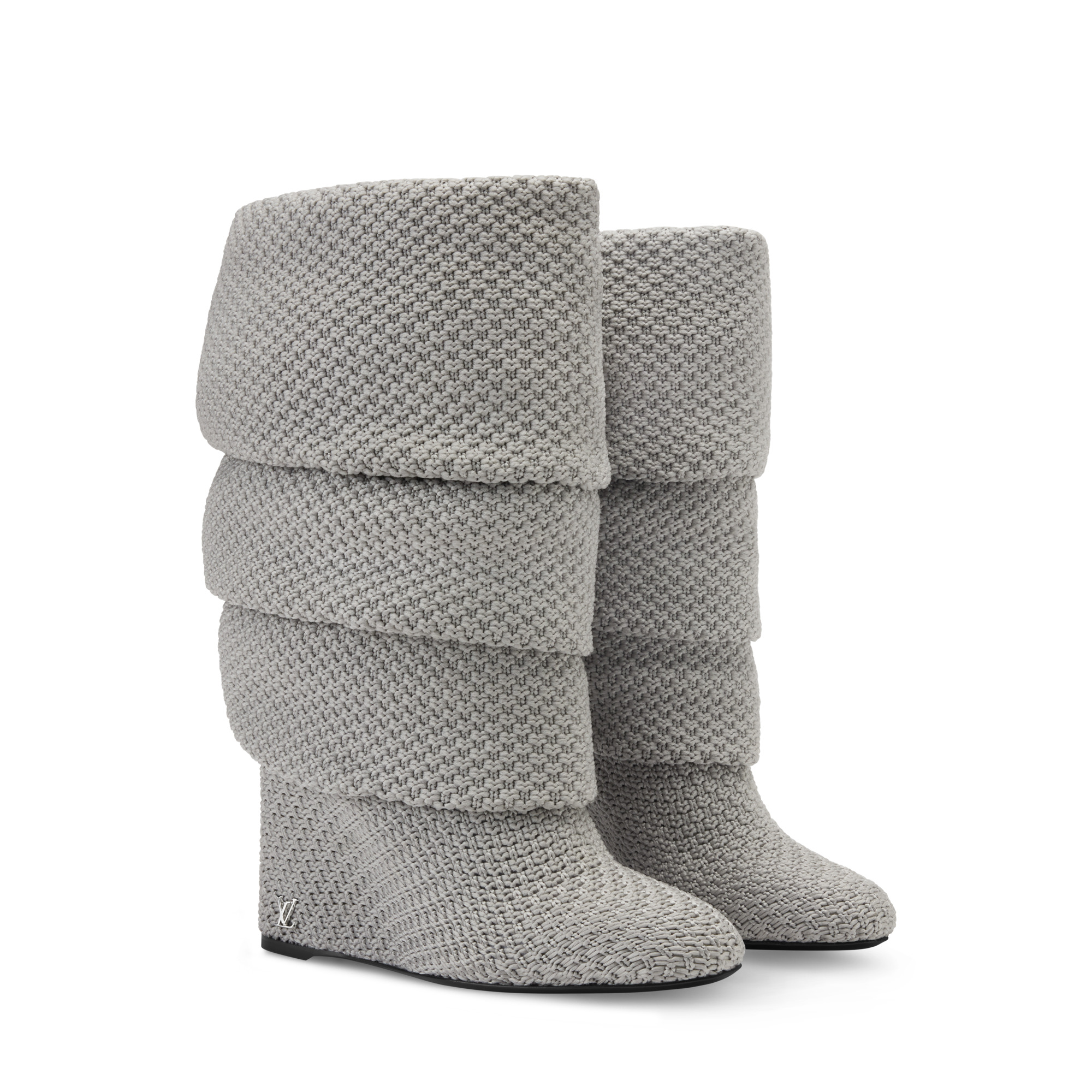 The Summer mid wedge boot was seen on the runway at the Louis Vuitton Fall-Winter 2025 women's show. Crafted from specially developed boucle knit, this model was inspired by the disco period. Its elegantly slouchy silhouette is accentuated by its high wedge heel, which is signed with an LV Initials stud. - Gray - Knit - Signature details - Leather outsole - Wedge heel, 9cm/3.5 inch - Made in Italy