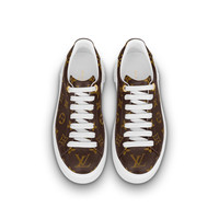The Time Out sneaker is crafted from Louis Vuitton's signature Monogram canvas. This model is characterized by its fashionable, elevated outsole in white rubber, which is debossed with a pattern of Monogram Flowers. Bright white laces complement this design, which is finished with two engraved, gold-tone eyelets. Detailed Features - Cacao Brown - Patent Monogram canvas - Elevated, treaded rubber outsole - Louis Vuitton-engraved eyelets - Monogram Flowers on the outsole - Made in Italy