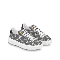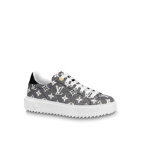 This chic rework of the Time Out sneaker comes in gray Monogram denim to coordinate with the Cruise 2023 leather goods collection. One of Louis Vuitton's emblematic styles, this model is distinguished by its fashionable, elevated outsole, which is decorated with Monogram Flowers. White laces and engraved, gold-tone eyelets complement this design. Detailed Features - Gray - Monogram denim - Elevated, treaded rubber outsole - Louis Vuitton-engraved eyelets - Monogram Flowers on the outsole - Made in Italy