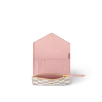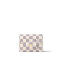 The compact Victorine wallet in Damier Azur canvas combines femininity and functionality. It opens out to reveal many practical features, including card slots and pockets for bills and coins. Its envelope-style flap is sealed with a press-stud.The piece is either finished with a gold or color-matched press-stud. Detailed Features - Rose Ballerine Pink - Damier Azur coated canvas - Grained cowhide-leather trim - Grained cowhide-leather lining - Gold-color hardware - Press-stud closure - Zipped coin pocket - Bill pocket - 2 flat pockets - 6 card slots - The reference is either made in France, Spain, Italy or in the US. Length: 4.7 inches Height: 3.7 inches Width: 0.6 inches