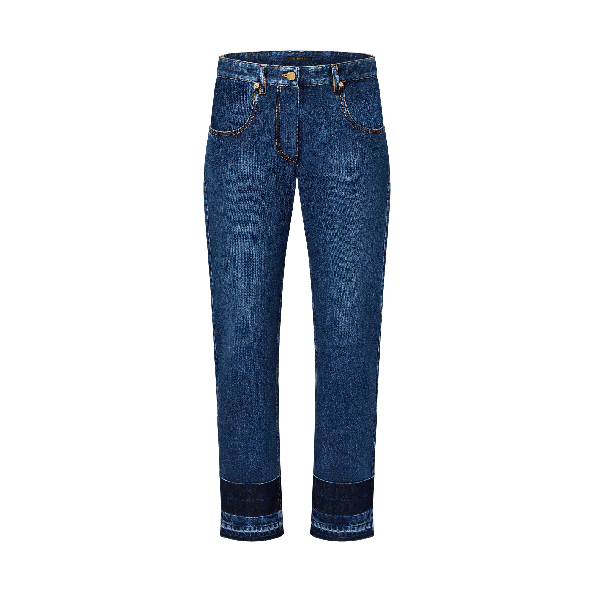 These slim-fit jeans are an elevated essential in soft and comfortable washed raw denim with the ankles and right pocket highlighted in a darker shade of blue. Classic yellow topstitching highlights the construction, while a Monogram canvas patch adds a discreet signature to the back of the waistband. - Main Material : 100% Cotton - Indigo - Made in Italy