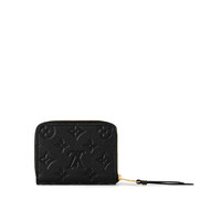 The Zippy coin purse is crafted from supple Monogram Empreinte leather, embossed with the iconic Monogram pattern. This model is small enough to fit into almost any pocket or bag, yet large enough to hold cards and folded bills as well as change. Its all-round zip is finished with an LV-engraved pull. Detailed Features - Black - Monogram Empreinte embossed supple grained cowhide leather - Supple grained cowhide-leather trim - Grained cowhide-leather lining - Gold-color hardware - Zip closure - 2 large gusseted compartments - 2 inside flat pockets - Business card slot - 4 card slots - The reference is either made in France, Spain, Italy or in the US. Length: 4.3 inches Height: 3.3 inches Width: 0.8 inches