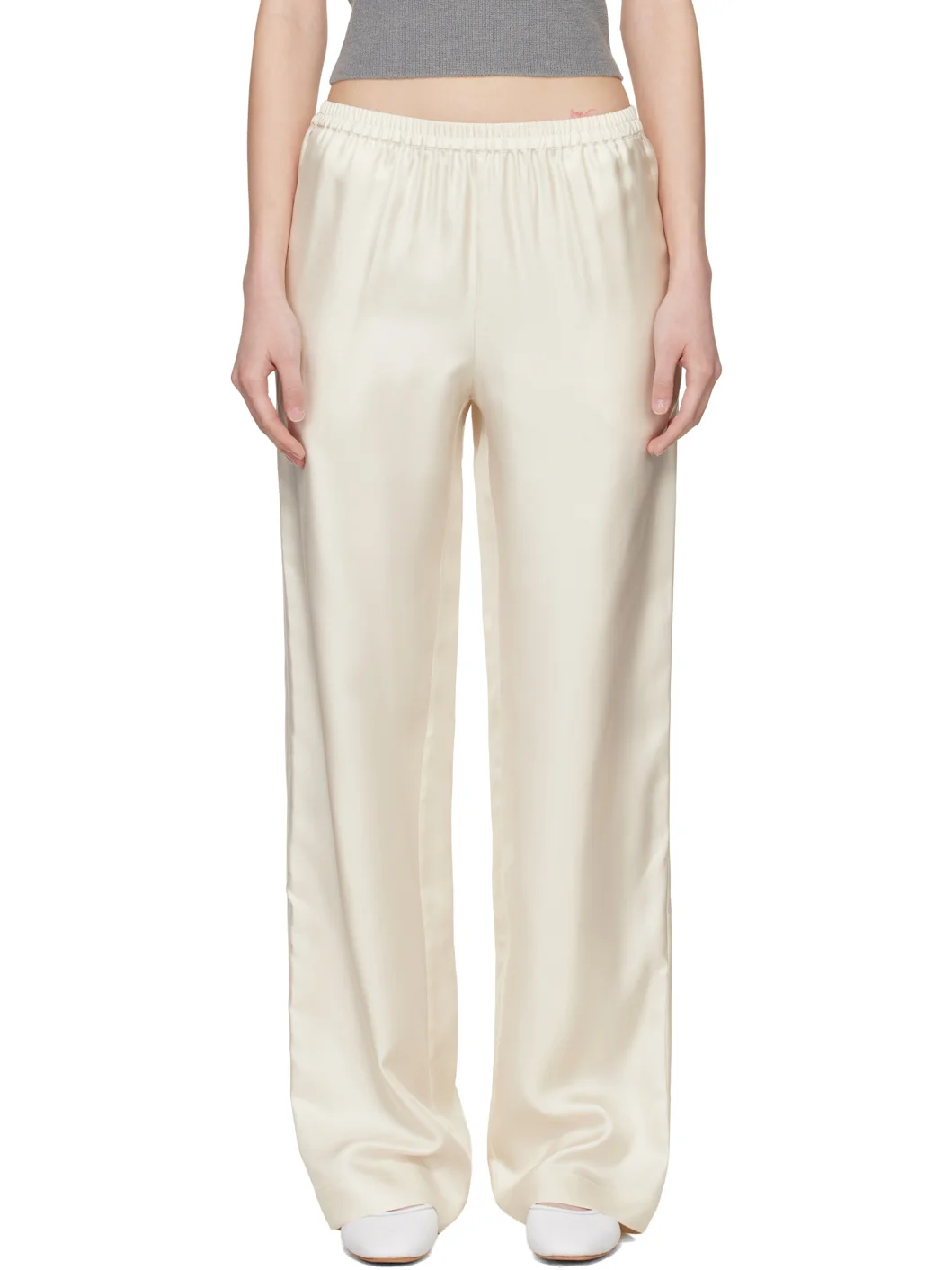 Lightweight silk satin twill trousers. · Certified OEKO-TEX® Standard 100 · Elasticized waistband · Three-pocket styling Supplier color: Ivory 100% silk. Made in Italy 261473F087004