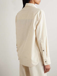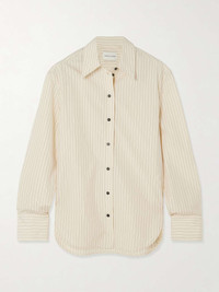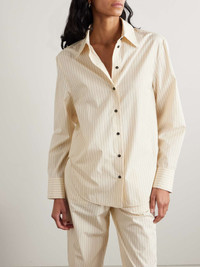 EDITORS'NOTES Creative Director Chloe Harrouche describes LOULOU STUDIO's clothing as "soft armors" that instill confidence. This 'Alim' shirt is cut from crisp cotton-poplin patterned with smart pinstripes. It has a rounded hem with slits at the sides, so it'll look polished when worn untucked, too. SIZE & FIT Model measurements: - Fits true to size, take your normal size - Designed for a slim fit - Mid-weight, non-stretchy fabric - Model is 177cm/ 5'10" and is wearing a FR 36 - Bust: 81cm/ 32" - Waist: 64cm/ 25" - Hip: 89cm/ 35" DETAILS & CARE - Ivory and black cotton-poplin - Button fastenings through front - 100% cotton - Machine wash or dry clean