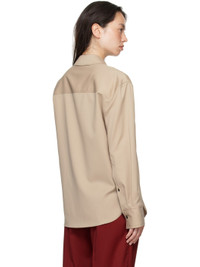 OEKO-TEX® STANDARD 100-certified virgin wool twill shirt. · Spread collar · Button closure · Shirttail hem · Logo embroidered at cuff · Pleats at single-button barrel cuffs Supplier color: Beige 100% virgin wool. Made in Romania 242473F109006