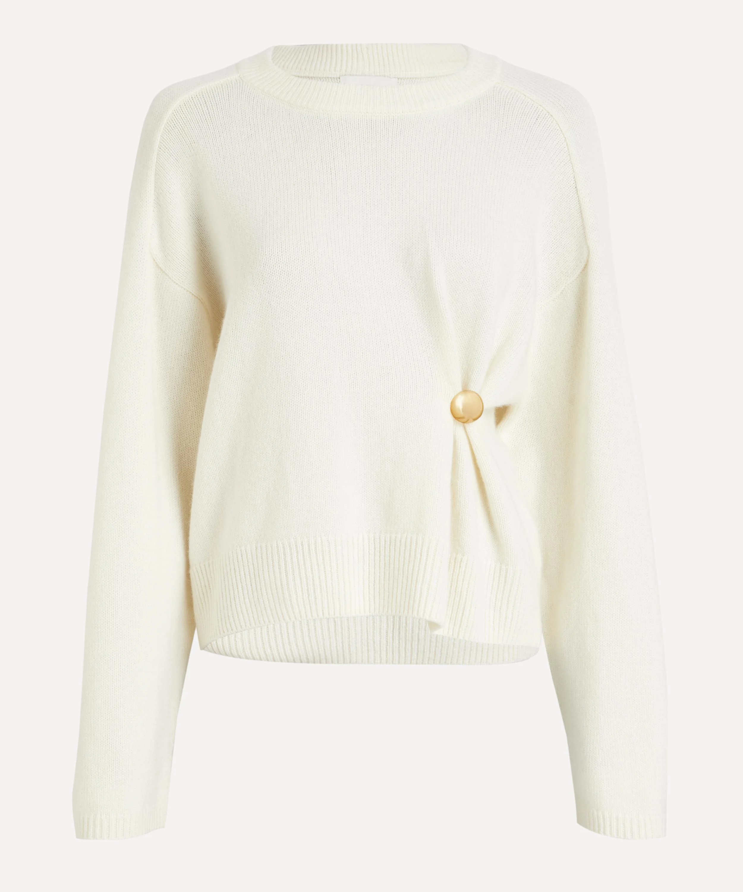 DETAILS Cashmere jumper Oversized fit Dropped shoulders Long sleeves Crew neckline Gathered waist with gold embellishment Ribbed trims SIZE & FIT Model is 178cm/ 5'10"; Chest: 81cm; Waist: 58cm; Hip: 91cm and wears a size S COMPOSITION & CARE 100% Cashmere Dry clean