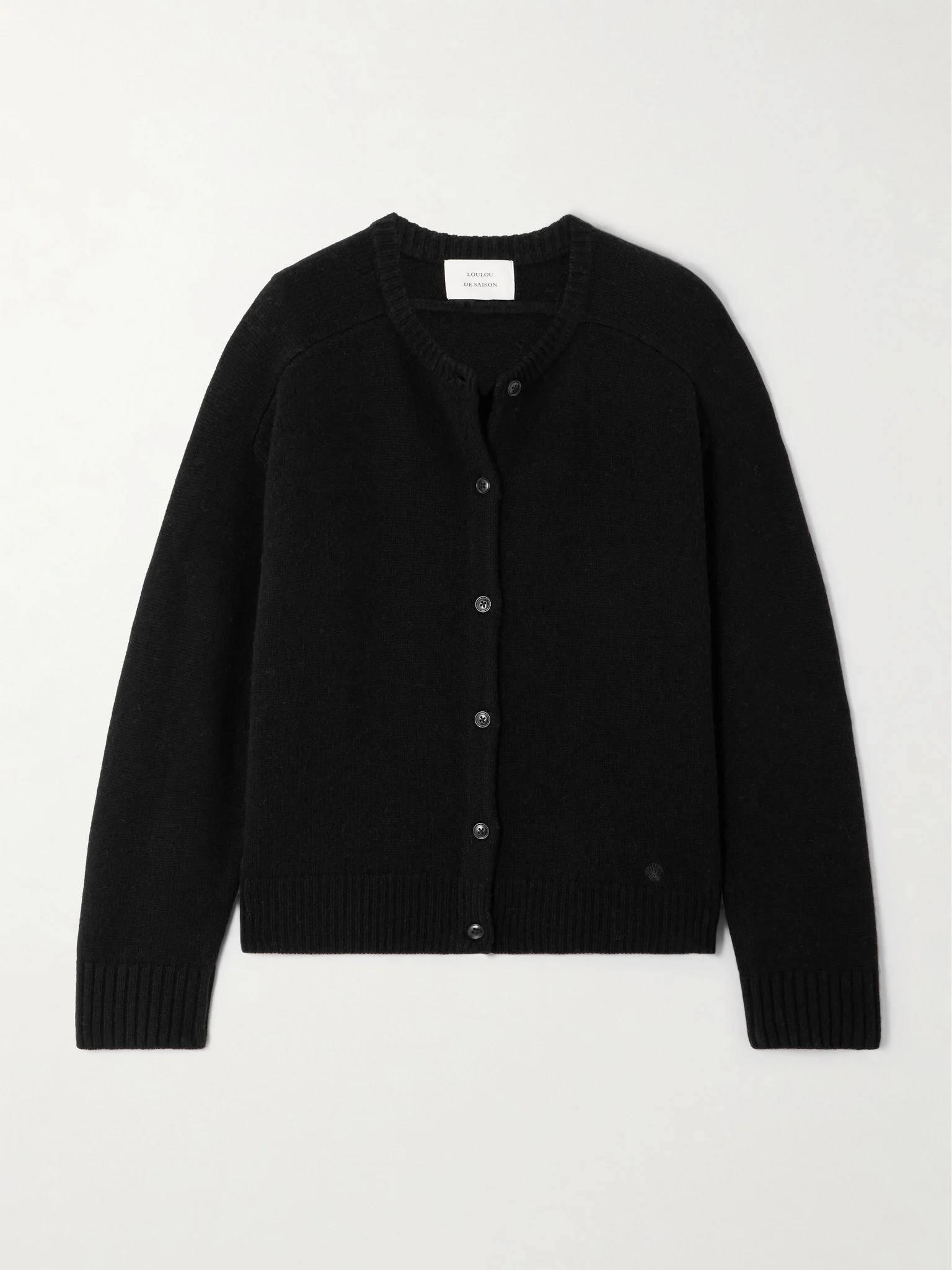 Loulou de Saison's staples are crafted from luxurious fabrics that make them feel so elevated. This cardigan is knitted from merino wool with a generous helping of cashmere, sourced from Inner Mongolia and prized for its natural softness and warmth. It has raglan sleeves and ribbed trims. Size & Fit - Fits true to size, take your normal size - Designed for a relaxed fit - Mid-weight knit - Model is 177cm/ 5'10" and is wearing a size Small Model measurements: - Bust: 80cm/ 31.5" - Waist: 60cm/ 23.5" - Hip: 89cm/ 35" Details & Care - Black merino wool and cashmere-blend - Button fastenings through front - 90% merino wool, 10% cashmere - Dry clean