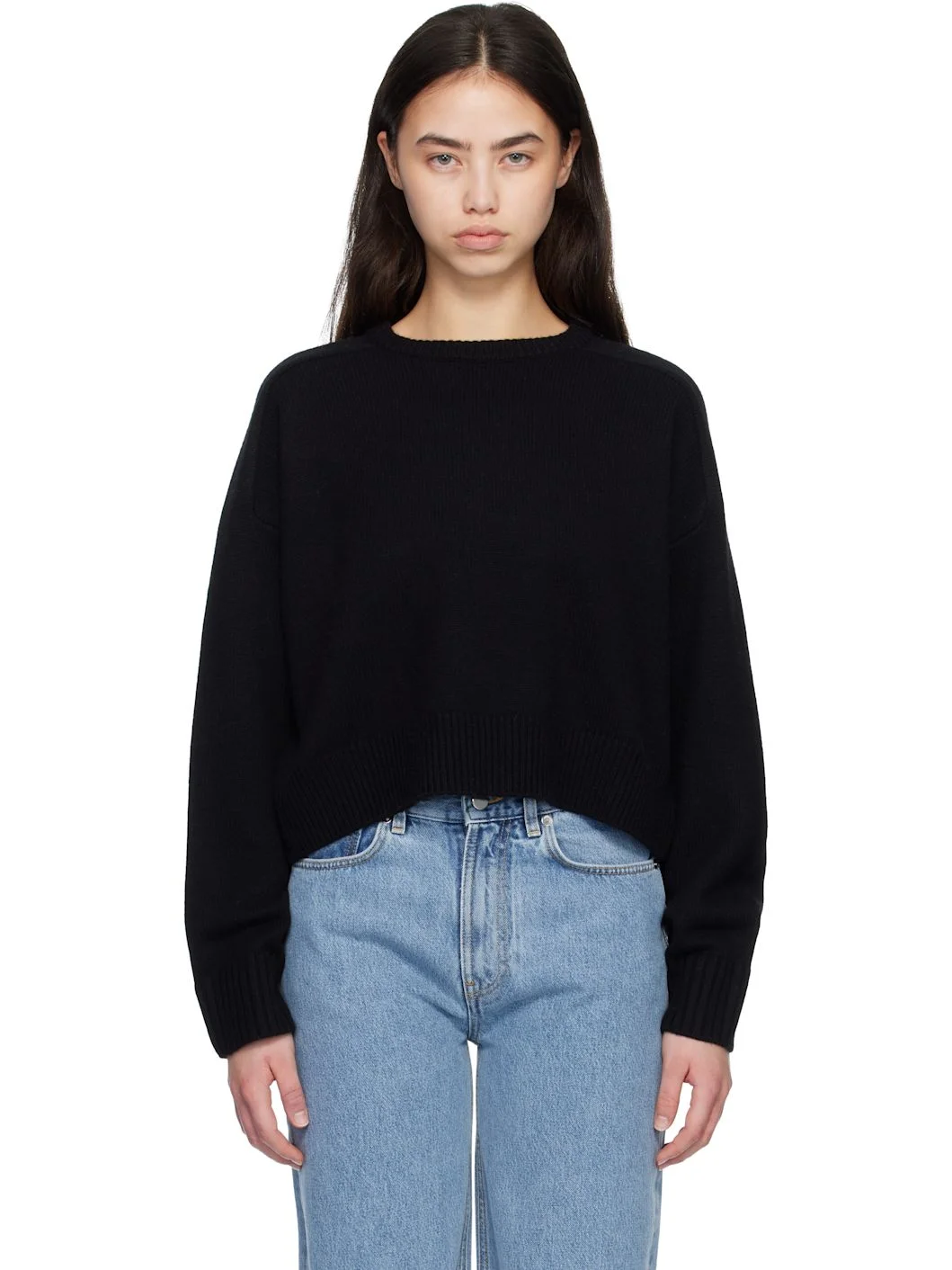 Knit extrafine merino wool- and cashmere-blend sweater. · Certified OEKO-TEX® STANDARD 100 · Rib-knit crewneck, cropped hem, and cuffs · Logo embroidered at front hem · Dropped saddle shoulders Supplier color: Black 90% extrafine merino wool, 10% cashmere. Made in Italy 261473F096005