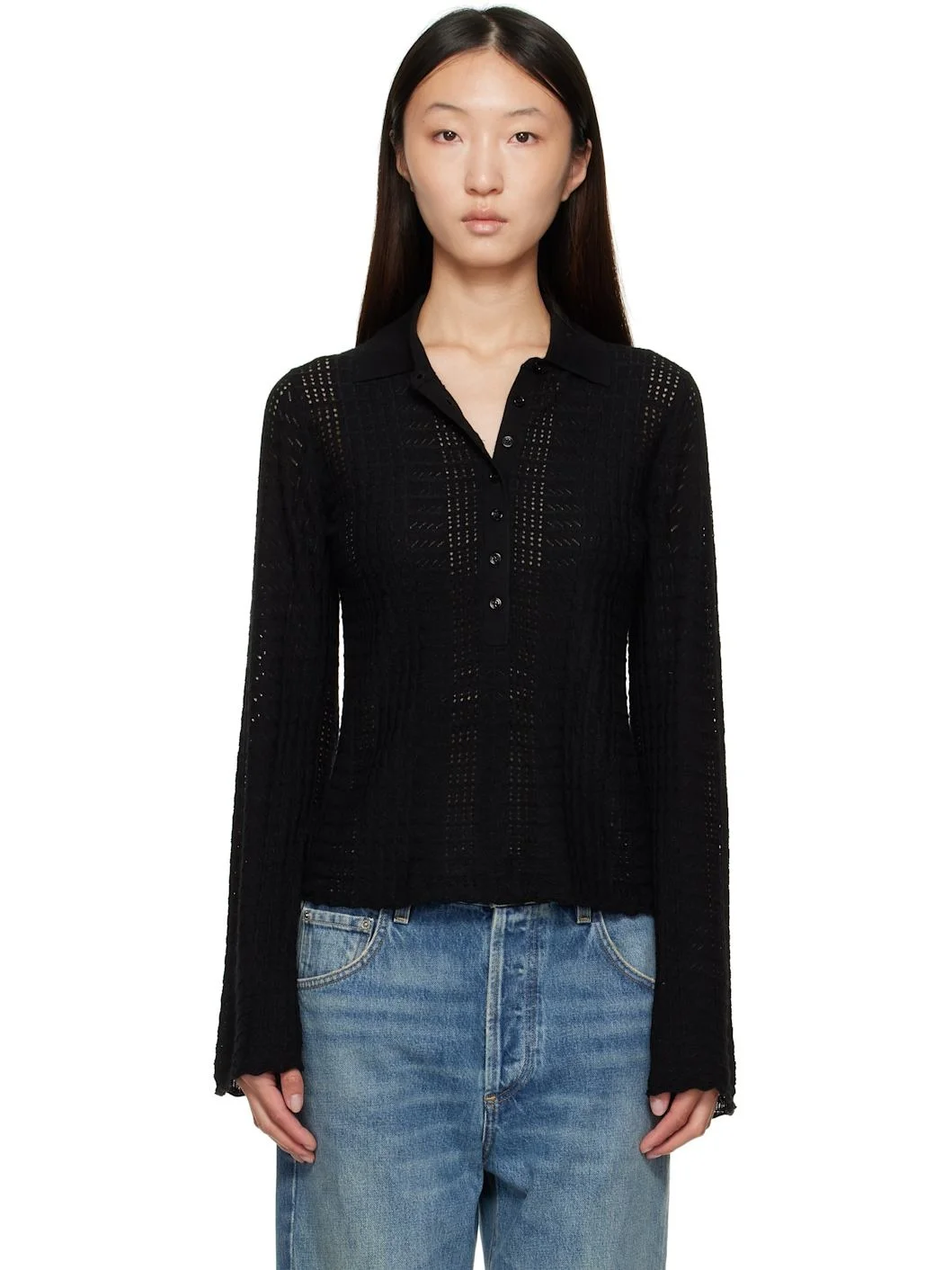 Pointelle-knit stretch wool- and cashmere-blend polo. · OEKO-TEX® STANDARD 100-certified · Semi-sheer · Spread collar · Seven-button placket · Scalloped edge at hem and cuffs Supplier color: Black 68% wool, 30% cashmere, 2% elastane. Made in Italy 252473F108006