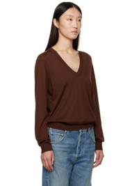 Knit cashmere sweater. · OEKO-TEX® STANDARD 100-certified · Rib-knit V-neck, hem, and cuffs · Dropped saddle shoulders Supplier color: Brown 100% cashmere. Made in Italy 252473F100006