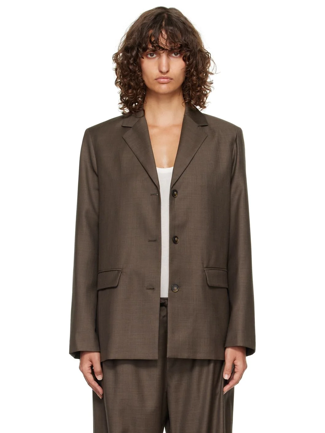 Plain-woven virgin wool blazer. · OEKO-TEX® STANDARD 100-certified · Notched lapel · Button closure · Flap pockets at waist · Padded shoulders · Central vent at back hem · Welt pocket at interior · Full satin lining Supplier color: Brown melange Body: 100% virgin wool. Lining: 100% viscose. Made in Romania 252473F057002