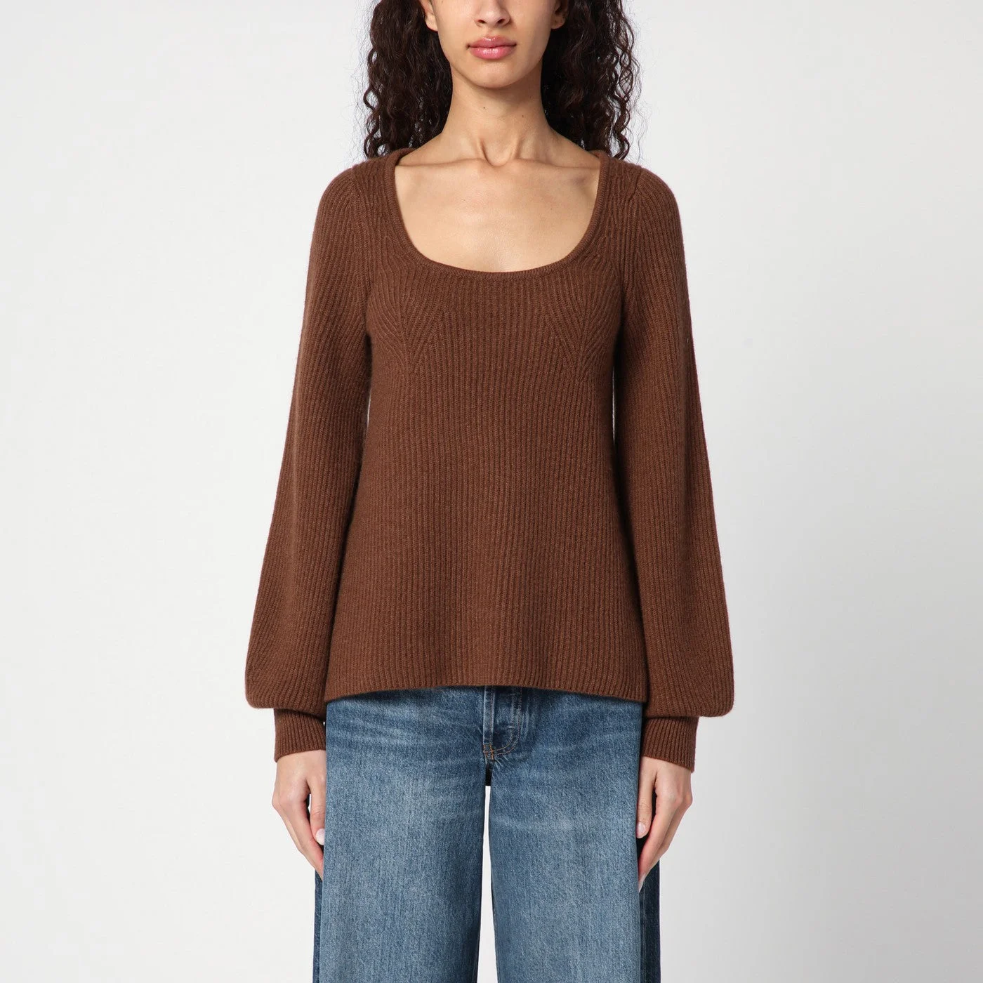 Crew-neck jumper by LouLou de Saison in brown ribbed cashmere featuring long balloon sleeves and side slits.