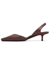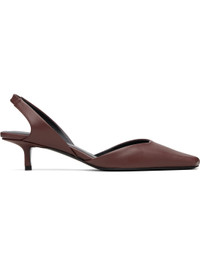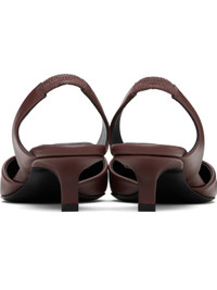 Buffed calfskin heels. · Square toe · Elasticized slingback strap · Logo embossed at padded footbed · Covered kitten heel with rubber injection · Leather sole · Heel: H1.5" Supplier color: Burgundy Upper: calfskin. Sole: leather, rubber. Made in Italy 252473F122002