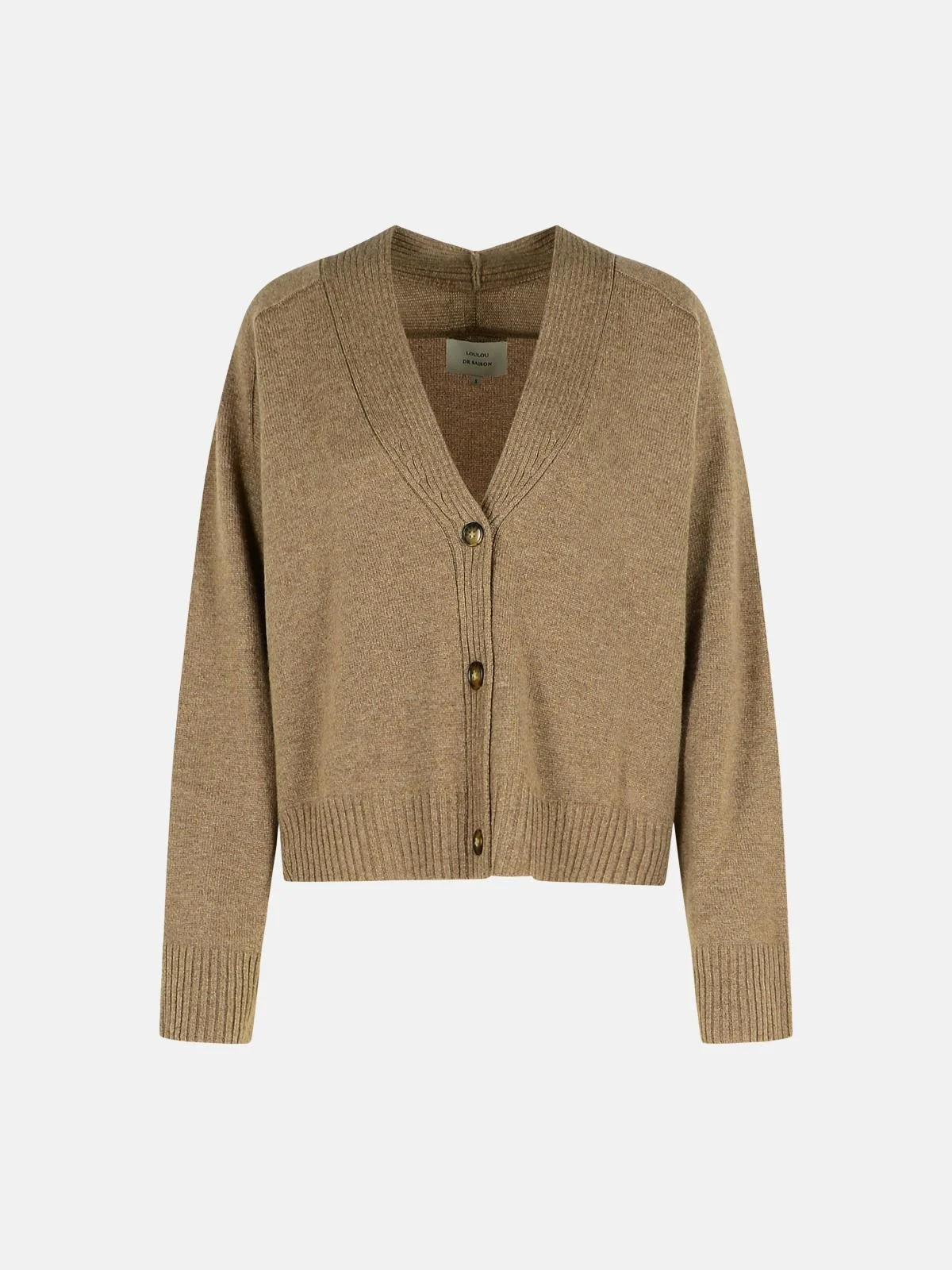 Manufacture code: KAIA TAUPE MELANGE Retail code: KAIA TAUPE MELANGE 'V' neckline, front button closure, side straps, ribbed details Main: 100% Kashmir Made in China