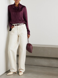 Loulou de Saison's 'Cyna' blouse is made from rich burgundy silk-twill that loosely skims your figure and has a lustrous finish. The draped neckline is complete with slim, dangling ties. Tuck yours into sharp tailoring or casual denim. Size & Fit - Fits true to size, take your normal size - Designed for a slightly loose fit - Mid-weight, non-stretchy fabric - Model is 177cm/ 5'10" and is wearing a size Small Model measurements: - Bust: 86cm/ 34" - Waist: 65cm/ 25.5" - Hip: 90cm/ 35.5" Details & Care - Burgundy silk-twill - Slips on - 100% silk - Dry clean
