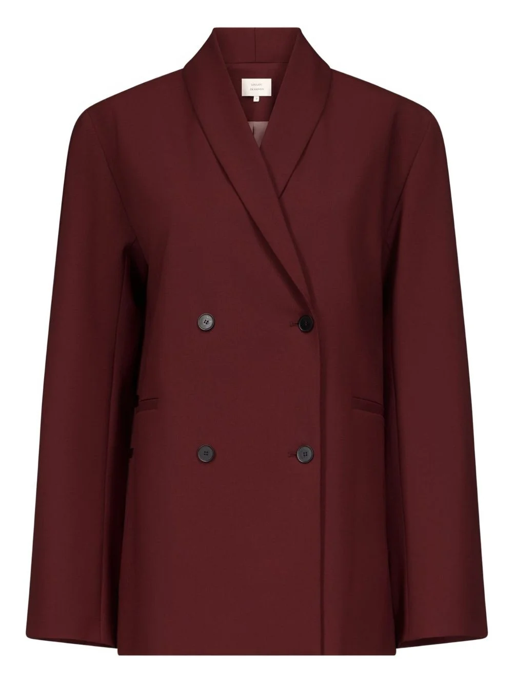 double-breasted blazer Highlights - Burgundy - Double-breasted opening - Shawl collar - Side welt pockets Imported Composition Fabric 100% Washing instructions Read Manufacturer Guidelines