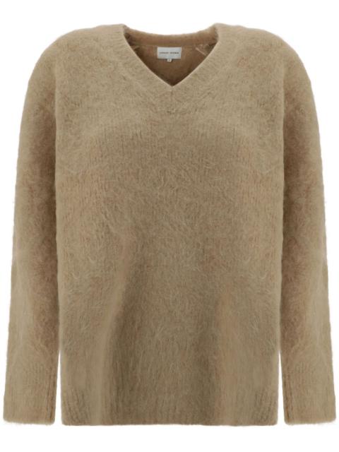 Goto jumper Highlights - Beige - Alpaca wool-blend - Brushed finish - V-neck - Long sleeves - Ribbed trim - Straight hem Imported Composition Alpaca Wool 79%, Polyamide 19%, Spandex/Elastane 2% SIZE & FIT FittingInformation Designed to be unstructured, offering a loose fit throughout Made with a midweight knit, this piece offers some stretch