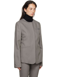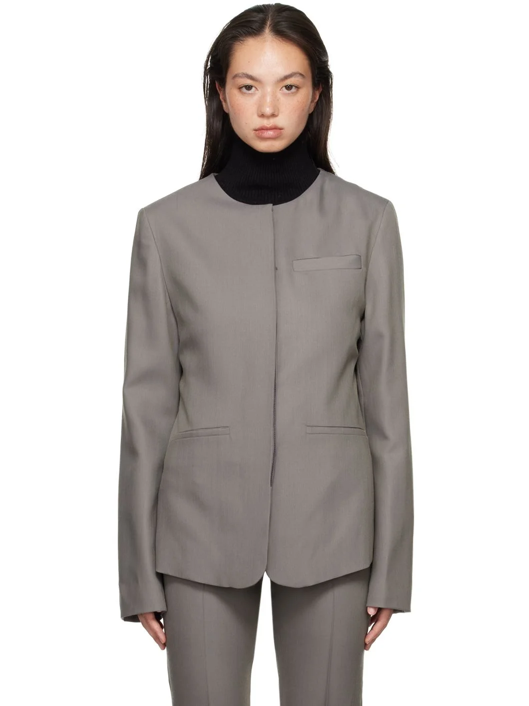 OEKO-TEX® STANDARD 100-certified viscose- and wool-blend twill blazer. · Round neck · Concealed button closure · Welt pockets · Padded shoulders · Vented cuffs · Full plain-woven viscose lining Supplier color: Grey Body: 50% viscose, 35% wool, 15% mohair. Lining: 100% viscose. Made in Romania 242473F057004