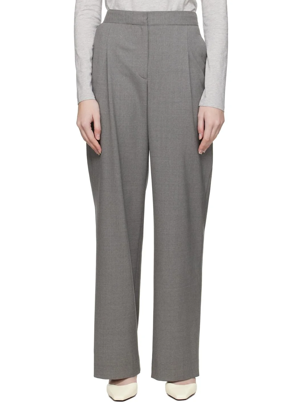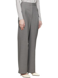 Straight-leg OEKO-TEX® -certified stretch virgin wool twill trousers. · Three-pocket styling · Zip fly · Darts at front and back waistband · Pleats at front Supplier color: Grey melange Body: 95% virgin wool, 5% elastane. Lining: 100% viscose. Made in Romania 251473F087003