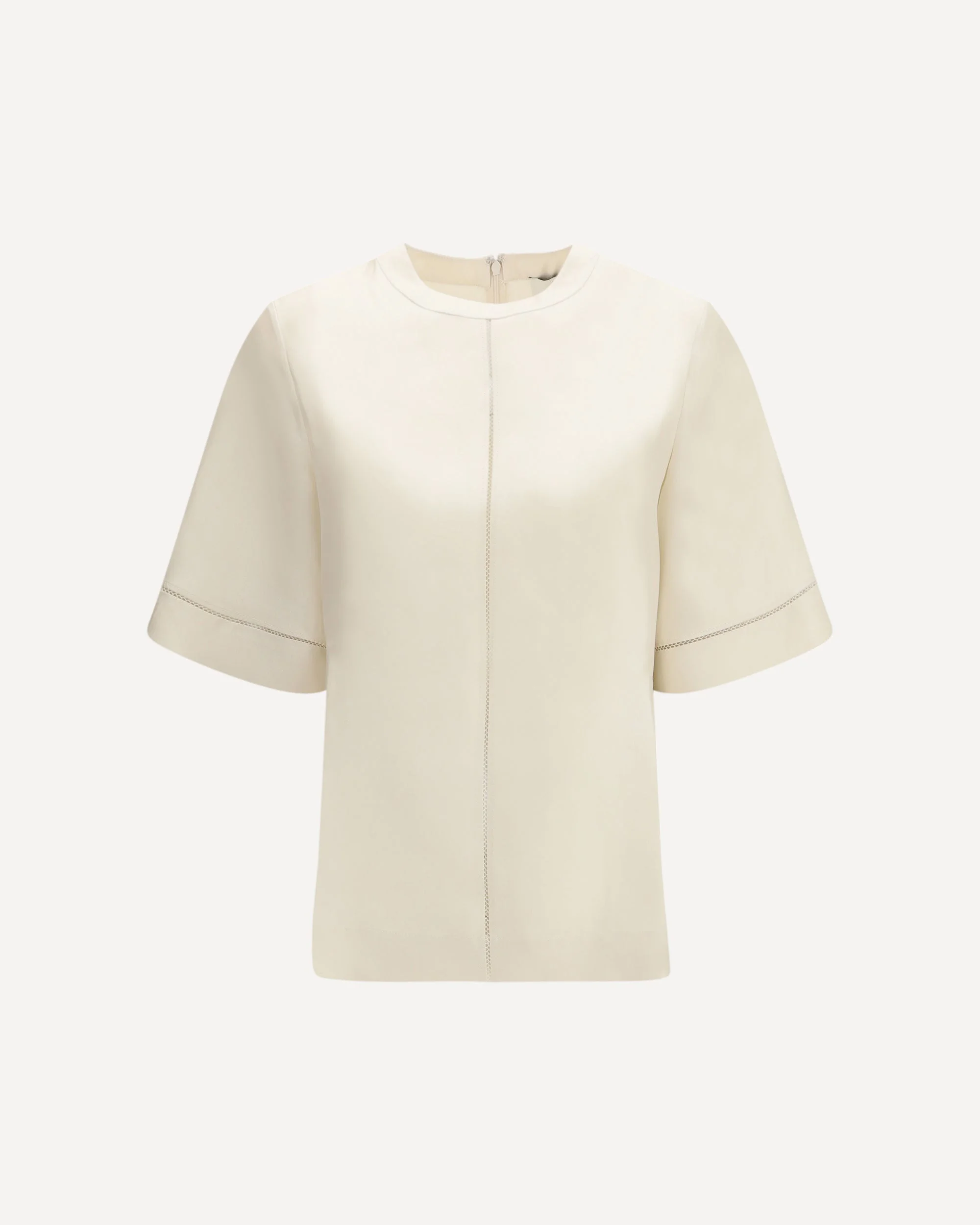 The Havana silk T-shirt by LouLou de Saison is an elegant and refined garment, characterized by a loose fit that guarantees comfort and fluidity. The graphic lines are enriched with lace details on the front, back, and sleeves, adding a touch of femininity and sophistication. Perfect for a casual-chic look, this T-shirt combines the luxury of silk with the delicacy of lace, making it ideal for elegant yet relaxed occasions. DETAILS - Sku: HAVANA_IVORY - Season: SS26 - Fit: Regular - Composition: GENERAL 100% Silk - MADE IN ITALY