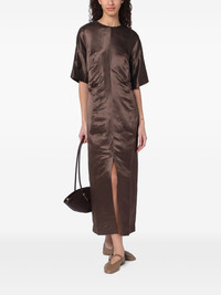 fitted midi dress Highlights - Chocolate brown - Rear zip fastening - Short sleeves - Front slit - Draped detailing Imported Composition Linen/Flax 70%, Silk 30% Washing instructions Read Manufacturer Guidelines