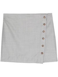 Mahaz virgin wool mini skirt Highlights - Light grey - Virgin wool - Wrap design - Rear welt pocket - Asymmetric hem - Side button fastening Imported Composition Outer: Virgin Wool 100% Lining: Viscose 100% SIZE & FIT Measurement LENGTH 15.74 in(40 cm) WAIST 32.28 in(82 cm) HIPS 37.79 in(96 cm)