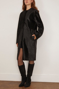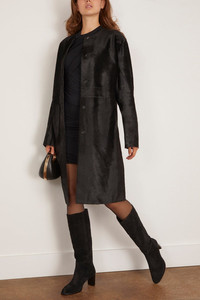 The Loulou de Saison Miller Calfskin Coat will be in your wardrobe for years to come. This coat is crafted in beautiful pony-effect leather with a straight silhouette an concealed placket for a streamlined look. Wear yours over a sweater and trousers. FIT DESCRIPTION MODEL MEASUREMENTS - Fits true to size, take your normal size - Coat - Straight silhouette - Knee length - Collarless - Concealed button placket - Pony-effect leather - 100% Calfskin - Rayna is wearing a size 34/ 2 US - Bust: 34” - Waist: 24” - Hips: 32” - Height: 5’8.5”