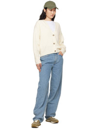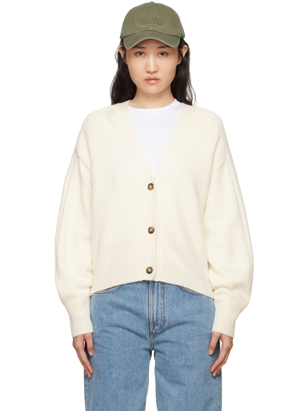 Knit OEKO-TEX® STANDARD 100-certified extrafine merino wool- and cashmere-blend cardigan. · Rib knit Y-neck, placket, hem, and cuffs · Three-button closure · Logo embroidered at front side · Dropped shoulders Supplier color: Ivory 90% extrafine merino wool, 10% cashmere. Made in China 242473F095002