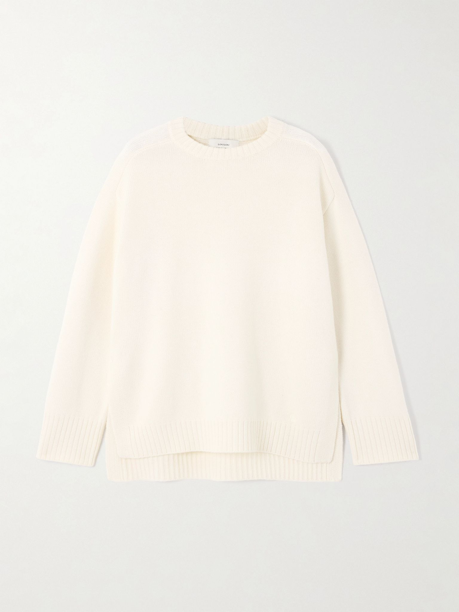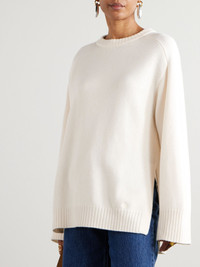Loulou de Saison works exclusively with beautiful materials that stand up to plenty of wear. This 'Safi' sweater is knitted in a relaxed, enveloping fit from merino wool blended with a hint of cashmere for extra softness. The shape is enhanced by dropped shoulders and vented hems. Size & Fit - Fits true to size, take your normal size - Designed for a slightly loose fit - Mid-weight knit - Model is 177cm/ 5'10" and is wearing a size Small Model measurements: - Bust: 86cm/ 34" - Waist: 65cm/ 25.5" - Hip: 90cm/ 35.5 Details & Care - Ivory merino wool and cashmere-blend - 90% merino wool, 10% cashmere - Hand wash