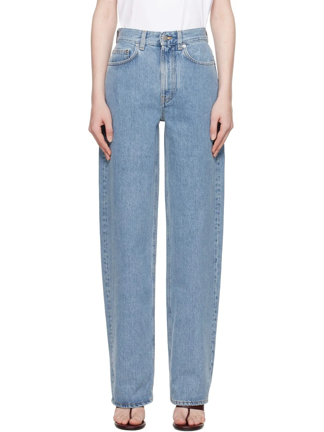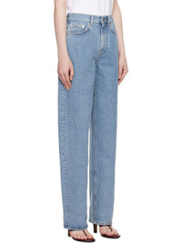 Loose-fit and straight-leg GOTS-certified organic cotton denim jeans. Fading throughout. · Low-rise · Belt loops · Five-pocket styling · Zip-fly · Logo patch at back waistband · Contrast stitching in tan Supplier color: Washed light blue 100% organic cotton. Made in Italy 251473F069000