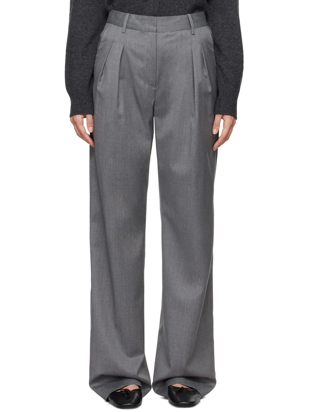 OEKO-TEX® STANDARD 100-certified virgin wool twill trousers. · Belt loops · Four-pocket styling · Zip-fly · Pleats at front · Creased legs Supplier color: Grey 100% virgin wool. Made in Romania 242473F087007